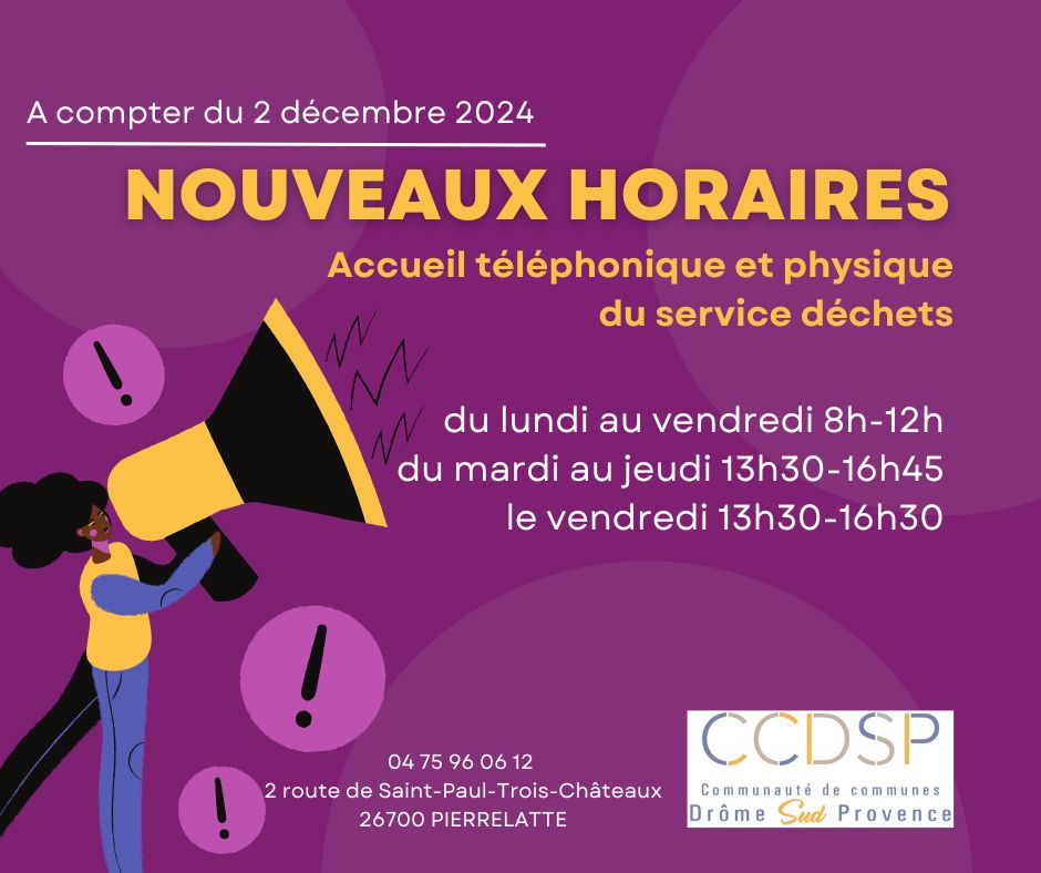 L’accueil du service déchets est ouvert le lundi de 8h00 à 12h00, du mardi au jeudi de 8h00 à 12h00 et de 13h30 à 16h45, le vendredi de 8h00 à 12h00 et de 13h30 à 16h30.